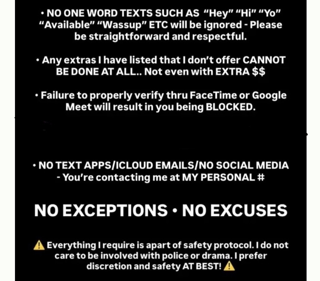for an amazing, fun time🥰. *safety first for ALL clients! * * NO explicit text/phone calls* * all i ask is that you have good hygiene🧡& be respectful🧡leave the rest to me 💦😉 When contacting me please provide your: AGE/RACE Durarion you would like to see me I DO REQUIRE VIDEO VERIFICATION✅ Also Sell Content & Custom Videos📸🎥 ⚠⚠Respectable gentleman only!! 100% discreet 100% Legit All donations are for my time and companionship only By contacting me you agree that you are not affiliated with any types of law enforcement MY DO NOTS: 🚫NO AA UNDER 30 🚫NO ANAL 🚫NO BAREBACK 🚫NO BBJ 🚫NO DATY 🚫NO GFE 🚫NO KISSING asking for any of these will get you immediately BLOCKED 🗣 please be advised that you are not the only one reaching out to meso it may take me a minute to respond, but I promise I will get back to you ASAP social media links: Onlyfans: they_luvv.layy Insta: they_luvv.layy Twitter: they_luvv_layy 🚿🛀COME CLEAN & FRESHLY SHOWERED 📣📣 IF YOU TRY TO LOWBALL ME TXTING MY PHONE WITH DOUBLE DIGITS YOU WILL BE BLOCKED IMMEADIATLY COME CORRECT OR KEEP MOVING 📣📣📣 🙌🏼🙌🏼DO NOT CALL ME UNTIL YOU ARE READY 💵💵 🥂